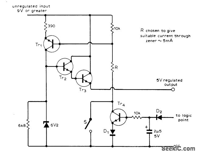 Circuit shows power supply designed to operate digital exposure timer using TTL. Since timer logic is needed only when enlarger lamp is on, power supply circuit will be turned off automatically when timer goes low and turns off enlarger lamp at end of exposure, Switch S is closed when timer cycleis activated, setting timer out-put at 5 V and turning on lamp. Transistor and diode types are not critical, Since D2 is con-netted to logic point of timer, power supply re-mains on when S is released, until completion of timer cycle.-E. R. Rumbo, Automatic Switch-Off Power Supply, WI'reless World, Feb.1976, p 77.