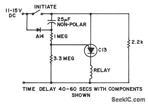 Power is applied to the circuit with the initiate switch open. The 25-μF capacitor charges through the A14, or equivalent, diode and 2.2-KΩ resistor to full supply voltage. When the initiate switch is closed, the low side of the capacitor is suddenly raised to + 12 V. This raises the diode side of the capacitor to approximately +24 V. The capacitor immediately begins discharging through the seriesconnected 1 and 3.3-MΩ resistors. Eventually, the C13 gate becomes forward biased, the device tums, and it applies power to the relay. The delay is virtually independent of supply voltage.