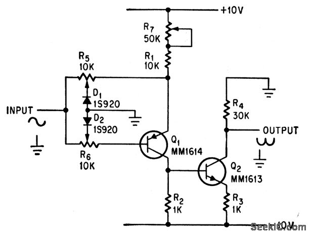 Each half-cycle of input sine wave produces negative half-cycle at output. Both input and output are referenced to ground. Operating range is from d-c to 10 Mc.-C. Yarker. Full-Wave Detector Without Transformer.Electronics.39:15,p100-101.