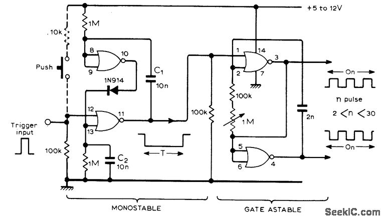 Each trigger input produces fixed number of pulses, between 2 and 30 depending on setting of 1-megohm frequency control. Monostable feeds gated astable, both realized with single CD4001 IC. Use dashed circuit with pushbutton for manual operation in place of trigger pulse.-K, Padmanabhan, N-Stable Multivibrator, Wireless World, April 1977, p 61.