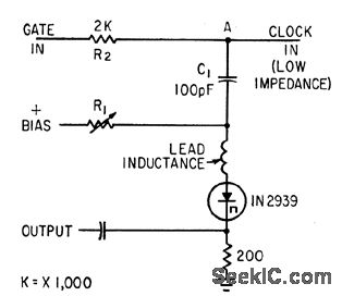 Impedance of tunnel diode is part of voltage divider, eliminating mood for a-c bridge in gate operating above 500 Mc.-F. W. Kantor, Tunnel-Diode Gate has Subnanosecond Rise Time, Electronics, 35:15, p 62-64.