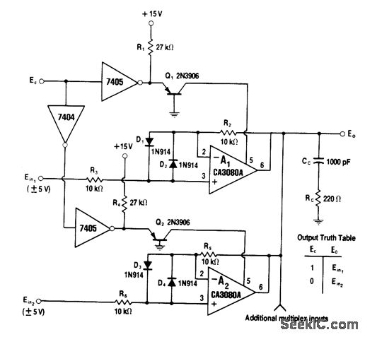Two CA3080A operational transconductance amplifiers are programmed on and off alternately by control logic, for multiplexing two inputs each up to ±5 V into single output. When control line E, is high or 1, input 1 appears at output; for logic 0, input 2 appears at output. Both channels operate at unity gain. Control logic is TTL-compatible.-W. G. Jung, IC Op-Amp Cookbook, Howard W. Sams, Indianapolis, IN, 1974, p 458-462.
