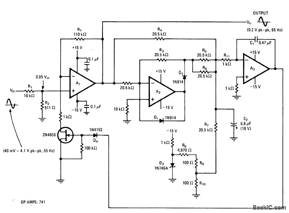 Output is maintained at 0.2V for inputs from 40mV to 4.1V. Voltage controlled JFET serves as variable control element. Comparator A3 produces error voltage that determines gain of A1, A2, and diodes form full-wave rectifier. Developed for use in radar seeker device to prevent overload of amplifier as target gets closer.-C. Marco, Automatic Gain Control oporates over Two Decades,Eleetriics, Aug,16、1973 p 99-100;reprinted in″Circuits for Electronics Engineers,″Electronics 1977、p 44-46