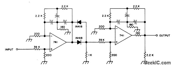 Uses diode threshold detector between stages to prevent weak undesired signals from passing through until CW signal of desired frequency is present, so as to provide quiet tuning between signals. Bandwidth of filter is sharp (16 Hz), and keyed waveform is good. Gain is near unity, and frequency and Q are both fixed.-A. F. Stahler, An Experimental Comparison of CW Audio Filters, 73 Magazine, JuIy 1973, p 65-70.