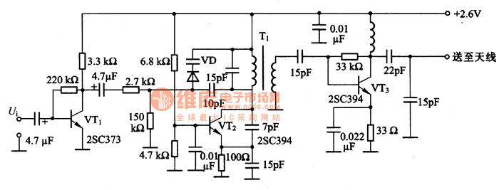 The FM circuit with the transfiguration diode is as shown in the figure. In this circuit, the VT1 changes the signal Ui which is produced by the electret condenser microphone into the operating voltage of the varactor diode VD. The LC oscillator circuit which is composed of the VT2 produces the 80MHz band signal. We can use the varactor diode VD to change the frequency of the resonant circuit, so we do the frequency modulation directly. When the output Vi is 3mV, the modulation frequency is +/-25khz. The VT3 is the high-frequency amplifier, it amplifies the modulated signal to 2.3mV and delivers it to the antenna.
