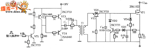 The gate isolated driving circuit shown in the picture applies the pulse transformer. This is the low-impedance output driving circuit which is composed of VT3 and VT4. In order to reduce the DC consumption, the isolated capacitor C1 is added to the circuit. VD1~VD4 selects the low drop voltage Schottky diode, VD4 and R1 are used to limit the negative peak voltage which is produced when the VF1 is limited.
