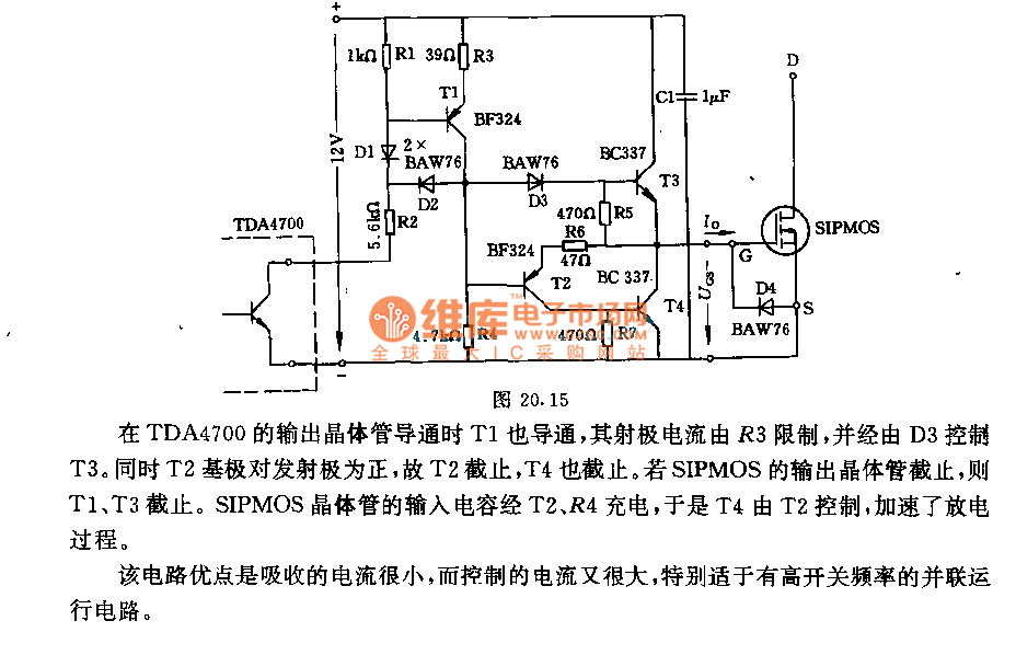 T1 is conducting when the output transistor of TDA4700 is conducting, the emitter current is limited by R3 and T3 is controlled by D3. At the same time, T2 basic pole is positive to the emitter, so T2 is blocked, so is T4. If the output transistor of SIPMOS is blocked, both T1 and T3 are blocked. The input capacitor of SIPMOS transistor is charged by T2 and R4, so T2 controls T4, which accelerates the discharging process. The virtue of the circuit is that the attracted current is low but the controlled current is high.
