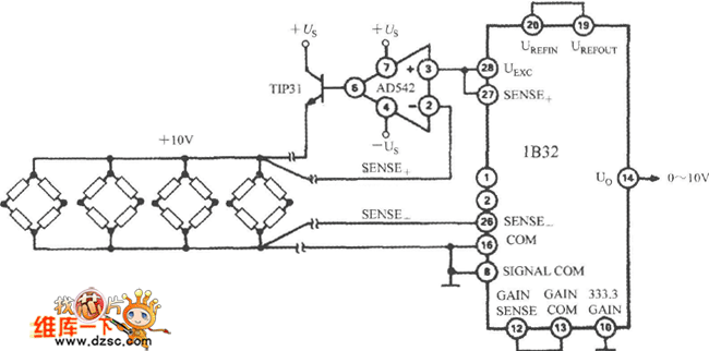 Excitation power can drive multiple bridge sensors after passing AD542, TIP32. AD542 is an op amp which uses Bi-FET as the input stage, and it play the role of starting buffer. TIP31 is the extension NPN power transistor with the maximum reverse voltage in 45V, the maximum collector current in 3A, maximum power consumption in 40W. The circuit can provide +10 V, 300mA excitation source in the temperature range of -25 ~ +80 ℃. When 333.3 GAIN of 1B32 is grounded, the gain is set to 333.3 times.