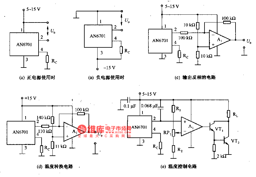 The application circuit of the AN6701 is as shown in the figure. The AN6701 has the features of high sensitivity, the cheaper price, the wide operating temperature range. The main characteristic parameters of it: the temperature range is -10 to +80℃; the sensitivity (Rc=1-100kΩ) is 105-113mV/℃, the nonlinearity is +/-0.5%; the thermal time constant in the still air is 24S, in the wind air is 11S; in the still air, the thermal resistance is 300℃. The output voltage of the sensor (25℃) can be set to 5.0V by the external resistor. The AN6701 is composed of the temperature-sensitive component, the temperature compensation component and the amplifier, it outputs the low impedance. It uses the miniature package to improve the thermal response characteristics.
