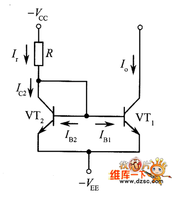 The basic circuit of the mirror constant current source is shown as the figure,and VT1, VT2 are MAPs. From the figure, the Ir = Ic2 + IB1 + IB2. Because VT1, VT2are symmetrical, the collector currentis equal tobase current, so
