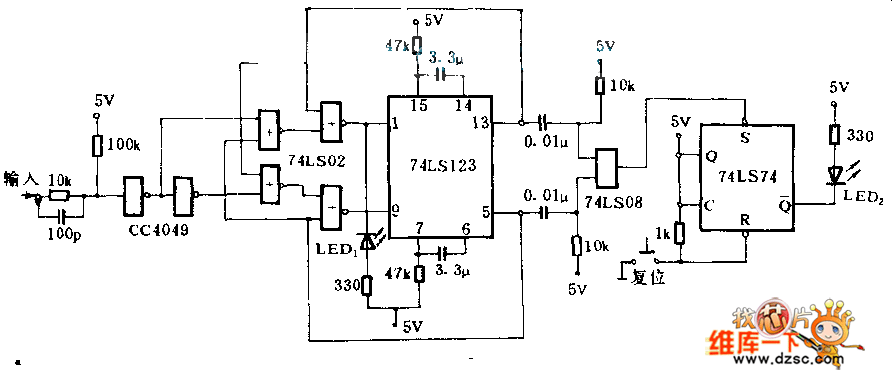 The circuit can be used for camera jitter detection. It is suitable for ±15V input signal. When the probe inputs 1, the negative trigger terminal of dual monostable circuit 74LS123 is in low level, light LED1 is lit, when the input falls down, 9 will be triggered and 5 has a transition. LED1 shows 20ms dark time. When the input is 0, LED 2 is dark, but the positive jump will make LED1 show 20ms light schedule. The 13 and 5 of 74LS123 have the function of memory.