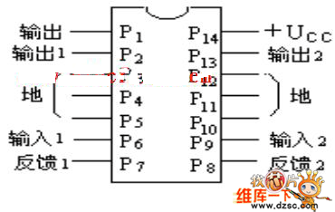 The configuration and pin circuit diagram of LM378 is as 7.46 shown. The main characteriatics: the supply is 10~35V, the output power is 4w, the input resistanceis 3kΩ, the gaining of voltage is 34dB, the bandwidth is 50KHz.