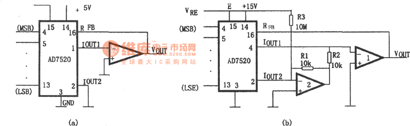 The AD7520 is an inexpensive, medium - resolution D / A converter chip, and it is composed of CMOS current switch and T resistor network, it has a simple structure, flexible configuration and good versatility. The connection method of the AD7520 basic circuit is shown as figure, wherein the figure (a) is a unipolar output basic conversion circuit; Figure (b) is the basic conversion circuit of the bipolar output.