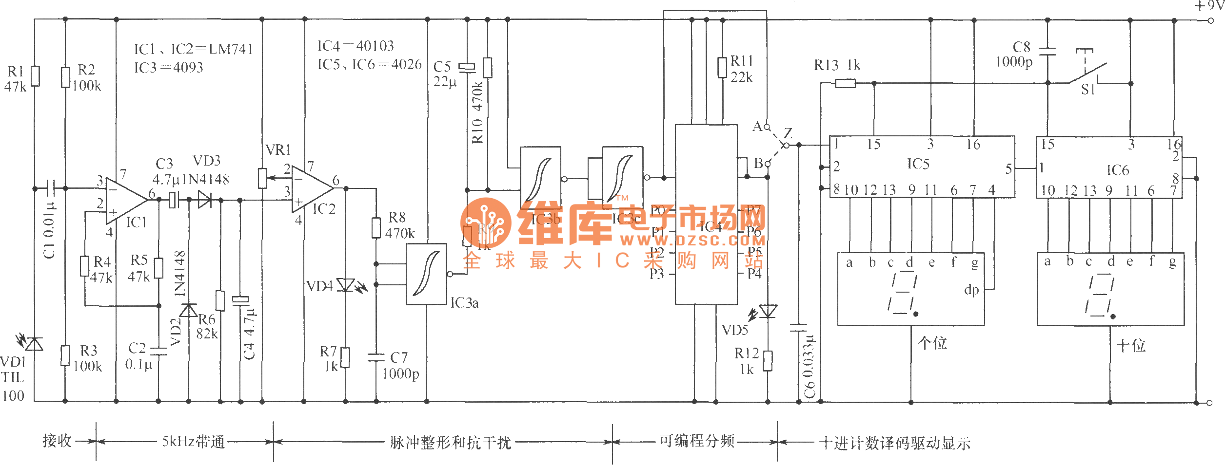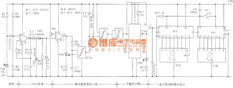 The counter with digital circuit is shown in the figure, and it uses infrared as detection signals, and it can be used for active target scan counting appliances. It is applied to the production line to rapidly and accurately count move items on the conveyor belt. It also can be used for other purposes such as inbound or outbound passenger counting. The characteristics of the circuit is simple structure, easy making, economical and practical use. The most outstanding advantage is that it can accurately count any items with different shade numbers.