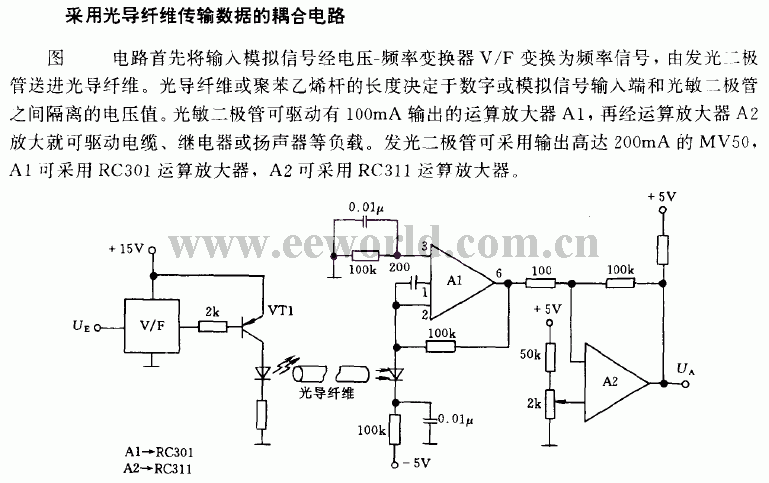 The circuit shown in figure can convert input analog signal into frequency signal by voltage V / F - the frequency converter, then it is sent to the optical fiber by light emitting diode. The length of optical fiber or polystyrene is determined the isolated voltage between the digital or analog signal input terminal and a photodiode. The photodiode can drive operational amplifier A1 with 100mA output.