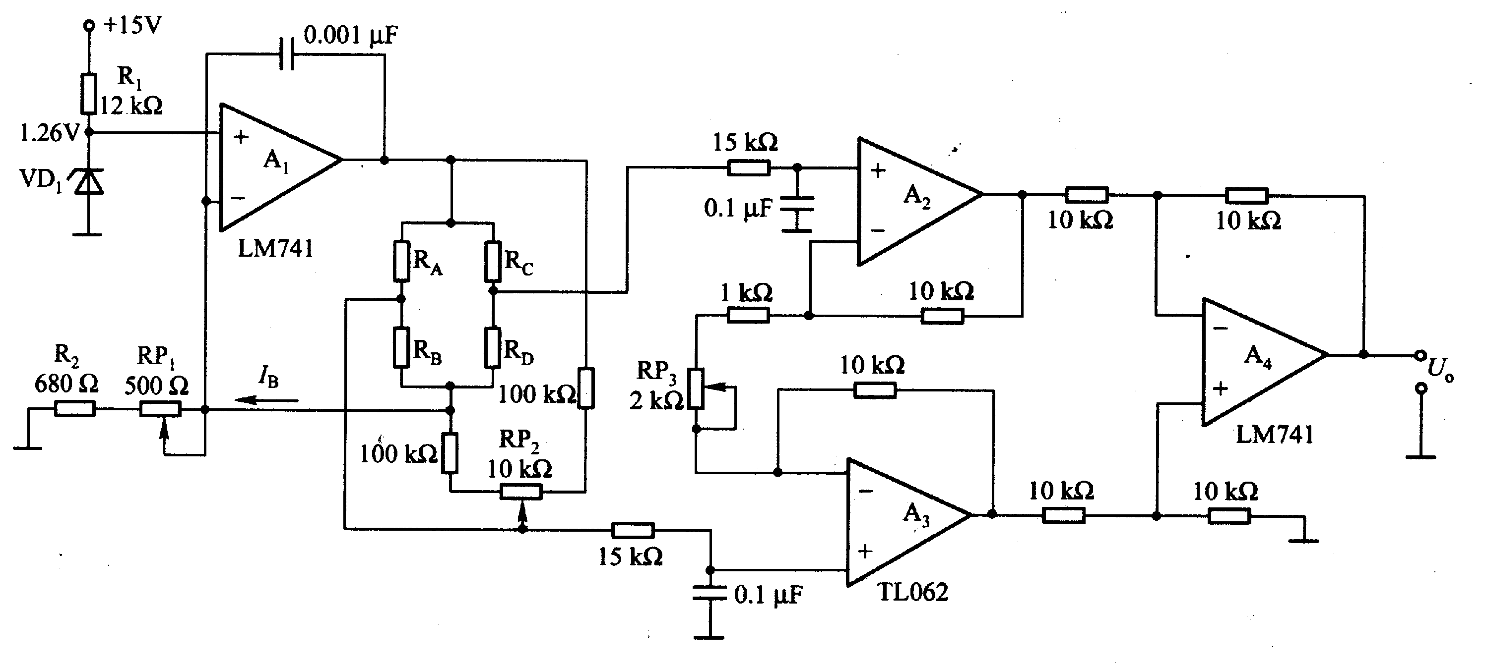 In the circuit, Al is the constant current output circuit, and constant value is decided by the UZ (VD1 stable voltage) and (R (RP1) + R2), and it is bridge sensor (RA-RD constitute a bridge circuit) to provide constant current bias. A2-A4 constitute an instrumentation amplifier, which can amplify the small signal output by sensor to the needed level.