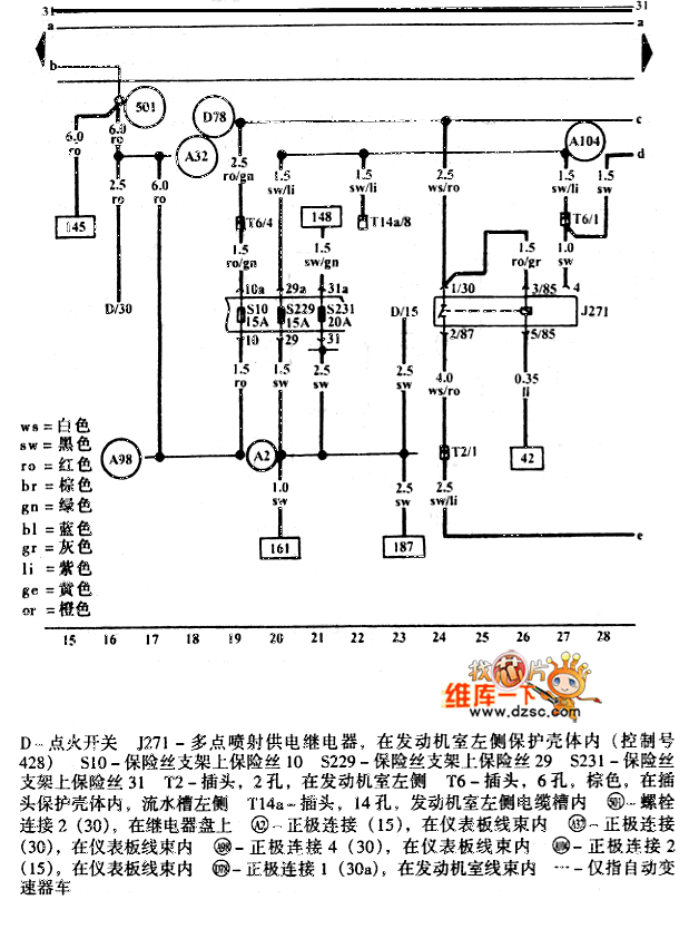 D-lighting switch; J271-multiple injection power supply relay, which is in the protecion shell on the left side of the engine room(the control No. is 428);S10-fuse on the holder 10; S229-fuse on the holder 29; S231-fuse on the holder 31; T2-plug, 2 holes, on the left side of the engine room; T6-plug,6 holes,brown, in the plug protection shell, on the left side of the flow tank; T14a-plug, 14 holes, on the left side of the wire way in the engine room