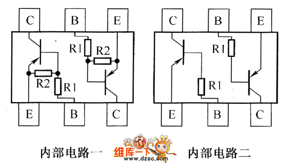 The inside circuit diagram of crystal triode DDA124EH、DDA143EH、DDA143TH、DDA144EH、DDA144EH-7 is as below: