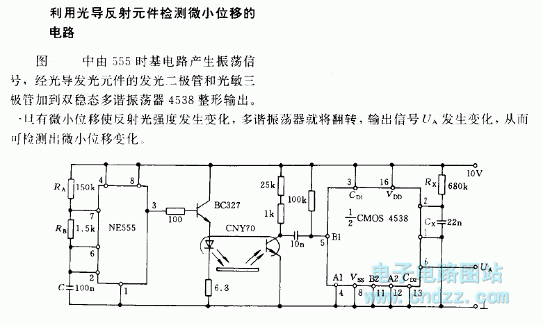 The 555 time-base circuit in the figure can generate oscillation signal, and it is added to the bistable multi -vibrator 4538 by photoconductive light-emitting diode and phototransistor, then it is shaped and output. Once there is a slight displacement makes the reflected light intensity change, the multivibrator will flip, then output signal UA changes, therefore the small displacement can be detected.