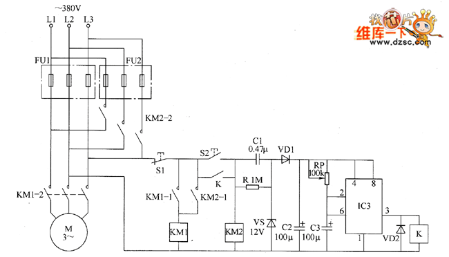 The motor dual insurance starter circuit is composed of the Road 1 fuse FU1, Road 2 fuse FU2, stop button R1, start button S2, AC contactors KM1, KM2, relay K, capacitors C1 ~ C3, diodes VD1, VD2, resistor R, voltage regulator diode VS, potentiometer RP and time-based integrated circuit IC, the circuit is shown as the chart. After people press the start button S2, KM2 pulls in and its normally open contacts KM2-i and KM2 ˉ 2 are connected, the motor M operates. At the same time, the AC voltage across L2, L3 is bucked by C1, stabilized by VS, filtered by VD1 and rectified by C2 to provide the +12 V power supply for IC. R uses 1W metal film resistor. RP selects small organic solid potentiometer or variable resistor. IC uses NE555 base integrated circuit.