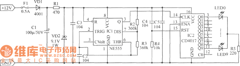 The circuit shown as the chart is the ring scintillator, it is mainly composed of the NE555, CD4017 and external circuit. NE555 constitutes a multivibrator, its square wave output from pin 3 will control CD4017 decoding output shift to turn on LEDs one by one, so that the LEDs flash in ring. The line flicker frequency shown as the chart is about 1.5Hz, operating current is less than 50mA. Component selection: IC1 selects 555 time base circuit, IC2 selects CD4017 integrated circuit. R1 selects (1 / 2) W metal film resistor, the other resistors choose (1 / 4) W resistors, LED0 ~ LED9 can select Φ5mm super bright red LED. Other components are shown as the chart.