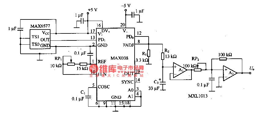 This is the thermometer circuit composed of MAX6577 integrated temperature sensors, the tested temperature range is 40一+125℃. Both RP1 and RP2 are used to regulate the deviation of the output voltage U. For example, the ℃ thermometer requires the output change to be lOmV/℃, when it is 0℃, by adjusting RP1, the output will be 0V; when it is -10℃, by adjusting RP2, the output will be -1OOmV.
