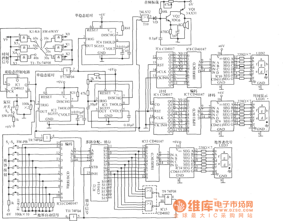 The circuit is shown as the circuit, the timing responder circuit is composed of the following parts: (1) clock pulse oscillation circuit. IC3 and its peripheral components form oscillator, period T = 1s. (2)display, light-emitting circuit (3) answer brake circuit (4) the end of the brake circuit when walking (5) resetting start (6) second frequency LED circuit:
