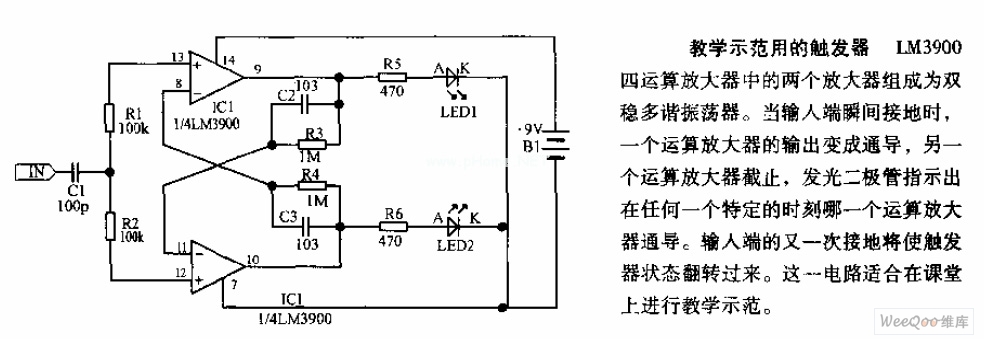 The two amplifiers in LM3900 quad op amp form the bistable multivibrator. When the input is grounded, the output of one op amp becomes conduction, and the other op amp stops, and light-emitting diode indicates which op-amp is conduction at any given moment. Input is grounded again, the flip-flop's state flips over. This circuit is suitable for teaching demonstration in the classroom.