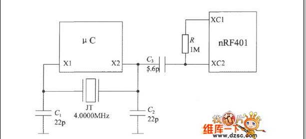 UDD uses +3 V supply. The R1, JT, C1 and C2 constitute the crystal circuit, and C3, C4 and R2 form the loop filter. R3 is the power set resistor. C5 is the power supply decoupling capacitor; C6 and C7 are noise reduction capacitors. DIN, DOUT terminals are respectively connected MCU TXD (serial output), RXD (serial input) sides. To simplify the circuit, nRF401 μC can be combined with a crystal oscillator circuit, the circuit is shown as below. X1, X2 are respectively μC crystal input end and output end, the resulting crystal frequency is directly sent to the XC2 side of nRF401.