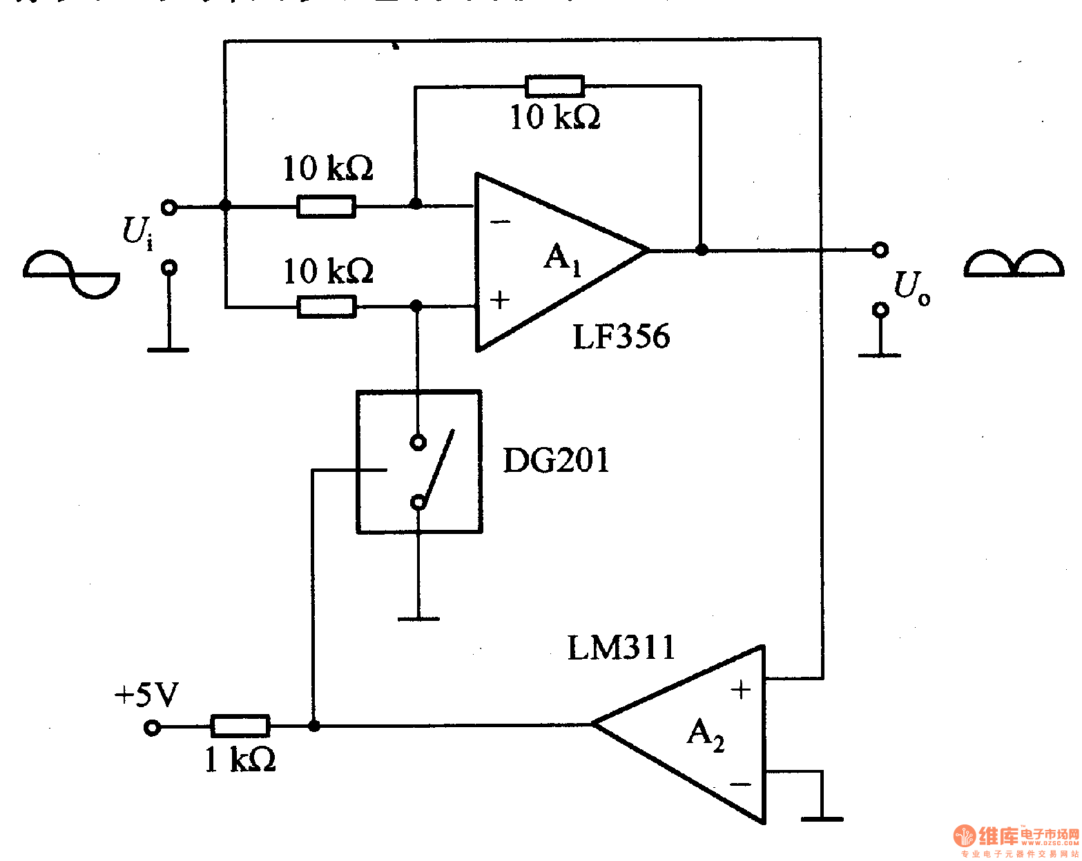 The circuit uses DG201 analog switch circuit and the zero-crossing comparator to control the polarity of the amplifier Al (in-phaseor inverting amplifier). When analog switch DG2O1 is off and the input signal is in positive half cycle, A2 output is in high level, and Al is a follower; when input signal is in negative half cycle, A2 output is in low level, then DGO1 is connected, and Al is equivalent to the inverting amplifier. In the circuit, A2 and DG2O1 is limited by the highest frequency, and the operating frequency is about lOkHz.