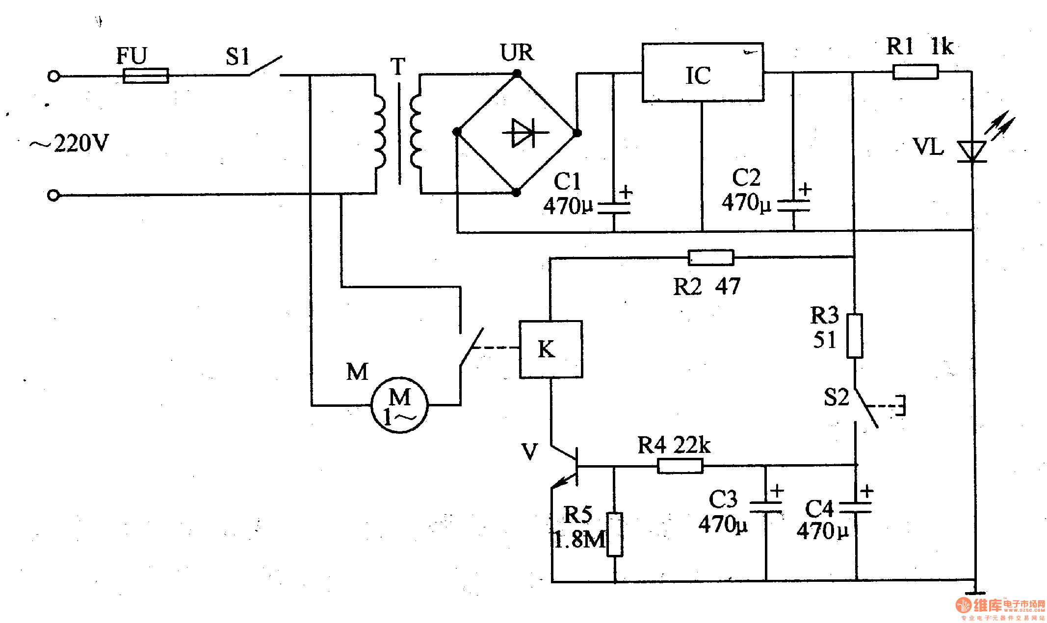 The power supply circuit is made of fuse FU, power supply switch S1, power transformer T, bridge rectifiers UR, filter capacitors C1, C2, there terminals steady voltage integrated circuit IC, current limiting resistor R1 and power supply indication LED VL.