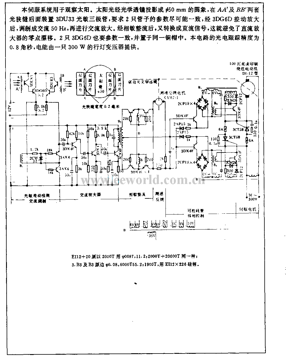 This servo system is used to observe sun. The sunshine is projected onto a Φ50mm round image by optical lens, to fix a 3DU33 photosensitive transistor to the later light slit of AA' and BB', it requires the parameters of two tubes should be as nearly as possible, after 3DG6D differentail amplifier, it is modulated into AC 50Hz, then it is AC amplified. After phase-sensitive rectification, it will be changed into DC singal, it can avoid the zero drift of DC amplifier. The parameters of two 3DG6D also should be coincided, and they are put into the same copper cap. The photoelectric tracing precision of this circuit is 0.8arc-second, the electrical energy is provided by a 300W portable lamp transformer.