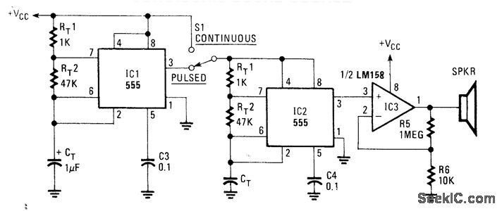 Using two NE555 timer IC devices, this circuit generates either pulsed or continuous ultrasonic signals. The sound frequency is:The values of CT for both pulse rate and ultrasonic frequencies can be calculated this way. SPKR is a small hi-ft tweeter.