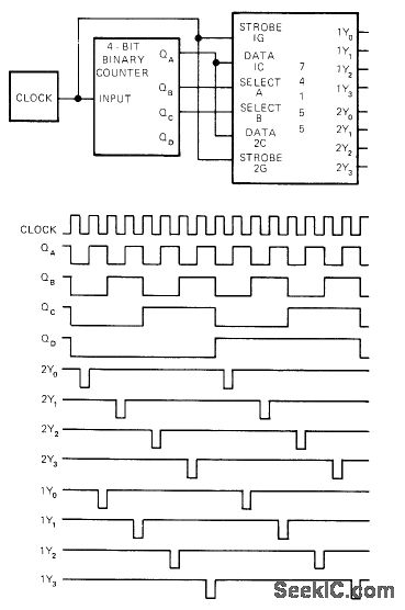 Combination of 74155 two-line to four-line decoder/demultiplexer with any conventional 4-bit binary counter provides family of strobe pulses staggered in such a way that pulse-edge ambiguity is impossible. Clock pulses at input serve to strobe 74155 as well as drive counter. QA of couter acts as data input, while QB and QC act as select lines. Action is such that edges of various 2Y pulses do not coincide with each other, with edges of 1Y pulses, or with edges of QB, QC, or QD pulses. Result is hazard-free strobing.-D. McLaughlin and C. Fanstini, End Edge Ambiguities with Two ICs, EDN Magazine, April 5, 1973, p 88.