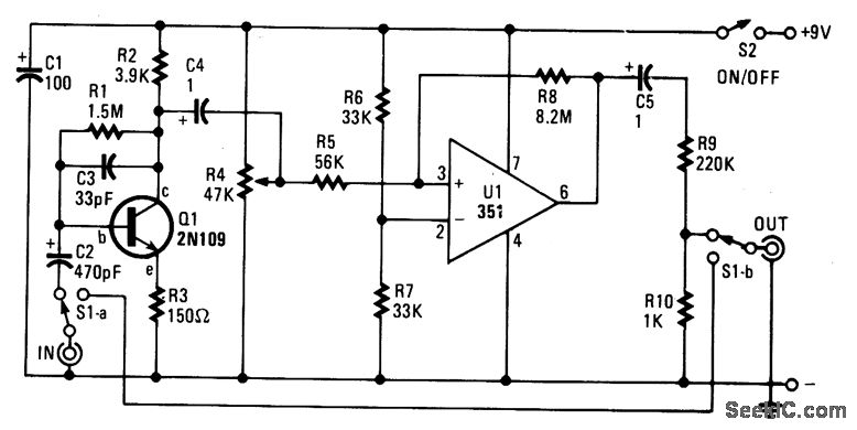 It seems that guitar fuzz boxes have been around since the beginning of rock, and have seen little improvement over the years. This one is somewhat different because rather than simply distorting the sound, it also pulses in step with the peaks of the waveform from the pickup because of the Schmitt trigger op amp circuit. Capacitor C2 requires some explanation. It should normally be a 1- or 2-μF electrolytic capacitor. However, we show the value as 470 pF because it's recommended as an experimental value giving fgr out effects.