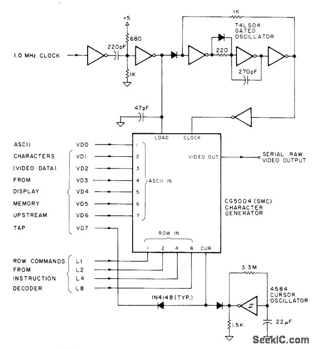 Standard Microsystems CG5004 alphamerle data-to-video converter provides both uppercase and lowercase characters and all numerals in serial video form for display as 7 x 9 character matrix on TV screen under microprocessor control. IC requires only single +5 V supply. Winking underline cursor is produced automatically by cursor oscillator. Internal shift register is part of IC. Raw video requires predistorting for clarity and addition of sync pulses before it can be fed to TV set.-D. Lancaster, TVT Hardware Design, Kilobaud, Jan. 1978, p 64-68.