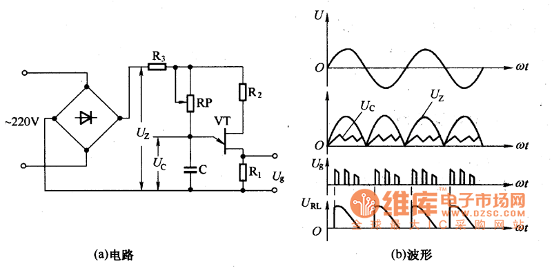 The waveform and the oscillation circuit of the unijunction semiconductor tubeThe circuit in the figure uses the bridge rectifier and it also uses the same power supply with the main circuit to achieve the synchronization. The URL is the voltage of load.