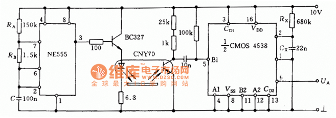 Figure oscillating signal generated by the base when the circuit 555 by emitting diode emitting element and a light guide phototransistor added 4538 plastic flip-resonant oscillator output once have tiny displacement of the reflected light intensity changes, multivibrator device will flip the output signal UA changes can be detected from the surface of the small displacement. Guiding light emitting element as shown in Figure small displacement detection circuit diagram: