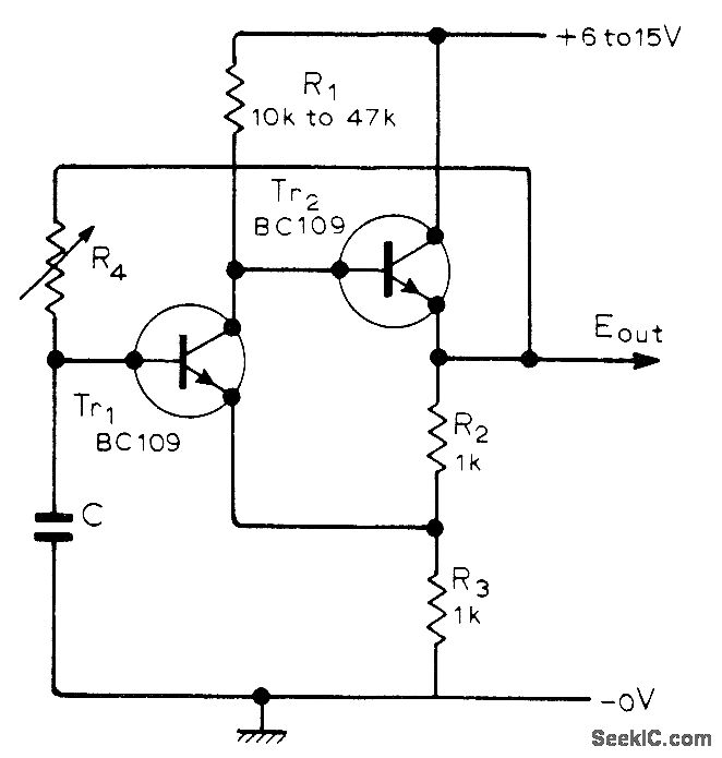 Frequency is determined by choice of values for C and frequency-control potentiometer R4.Square-wave output has almost equal mark-space ratio over wide frequency range. Regenerative action is rapid, reducing transition times. When circuit is switched on, C is uncharged and Tr2 is on. C charges until Tr1 begins to conduct, cutting off Tr2 and discharging C through R4 until Tr1 cuts off and cycle repeats.-J.L. Linsley Hood, Square-Wave Generator with Single Frequency-Adjustment Resistor, Wireless World, July 1976, p 36.
