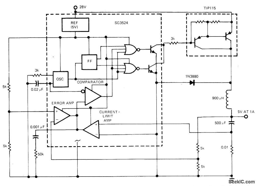 Duty cycle of SG3524 switching regulator is varied by modulating ON time while maintaining constant switching frequency, using pulse- du ration-modulation control circuit.-J. Spencer, Monolithic Switching Regulators-They Fit Today's Power-Supply Needs, EDN Magazine, Sept. 5, 1977, p 117-121.