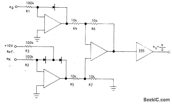 Practical analog divider follows ideal division equation over typical 20:1 range of reference current and operates in two quadrants. Circuit is analyzed in terms of logarithmic behavior of its elements. Bandwidths up to 5 MHz can be achieved. Article gives design equations.-L.Counts and D. Sheingold, Analog Dividers: What Choice Do You Have?, EDN Magazine, May 5, 1974, p 55-61.