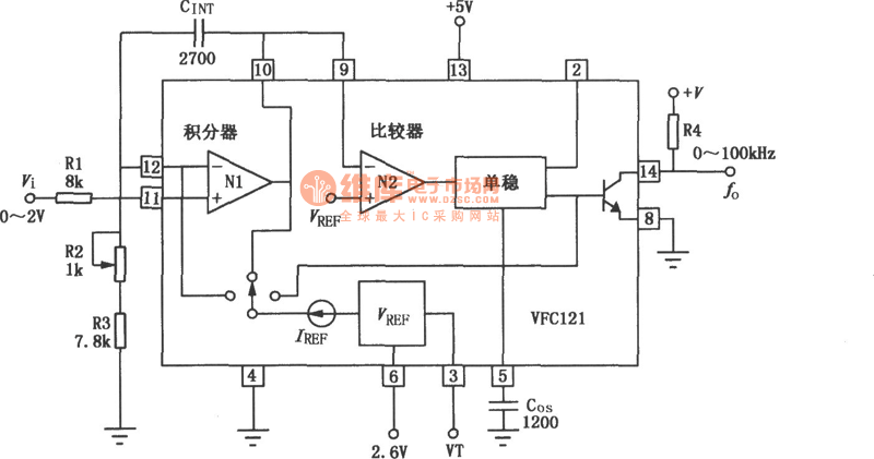 VFC121 uses high-frequency NPN / PNP charge balance technology to realize V / F conversion, and its power supply is flexible( 4.5 to 36V), and the voltage output is proportional to absolute temperature, thus it can be used as the system environment temperature measurement for D / A converters, data acquisition and system deviating occasion. VFCl21 uses 0IP 14-pin double-row arrangement package, and its pinout and internal circuit block diagram is shown as below.