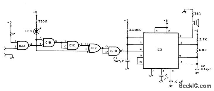 Indication of static state of terminal in digital logic is made audible forblind experimenter by using NE556 timer IC3 as oscillator controlled by IC1 (SN74132N) and lC2 (SN7486N). Any logic transition from 1 to 0 or 0 to 1, lasting at least 50 ns, is detected and indicated by audio beep. Visual indication is provided by LED that comes on when input is logic 1.-T. Lincoln, A Logic Probe You Can Hear, 73Magazine, Aug. 1976, p 106.