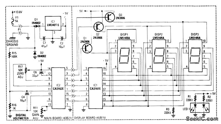 This circuit uses an RCA CA3162E (IC2) A/D converter. This converter has 12-bit output (BCD) which is sent to display decoder driver IC1. +5 V is obtained from IC1. R17 adjusts to 0 and R11 should be set to produce correct calibration of gauge unit. Displays are common cathode types. No limiting resistors are necessary because the output drivers are constant current. R15 and R16 sample the applied voltage (usually 8 to 18 V). LED1 is used to illuminate the gauge legend (Volts, Temp, etc.).