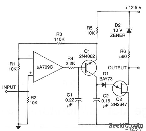 This circuit consists of a UJT oscillator in which the timing charge capacitor C2 is linearly dependent on the input signal voltage. The charging current is set by the voltage across resistor R5, which is accurately controlled by the amplifier.