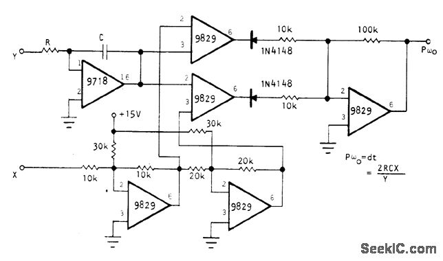 Optical Electronics 9829 opamps are used as fast comparators and 9718 FET opamp as fast integrator to give high precision at high speed for converting analog voltage to pulse duration for such applications as A/D conversion, delta code generation, motor speed control, and pulse-duration modulation. Output pulse durations can be as short as 1 μs. Conversion linearity is better than 0.1%. Minimum pulse duration is 100 ns, and maximum dynamic range is 40 dB. Reference voltages are determined by×input; if×is 3 V, reference voltages differ by 6 V. Two 9829 opamps present reference voltages to two com-parator opamps. Fifth 9829 sums comparator outputs and gives positive output.- Voltage to Pulse Width Converter, Optical Electronics, Tucson,AZ, Application Tip 10230.