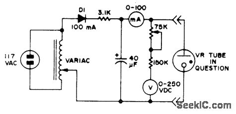 Increase output voltage of Variac gradually until VR tube fires, then read milliammeter and voltmeter. Good tubes will fire at their rated voltage and current values.-Circuits, 73 Magazine, May1977,p31.