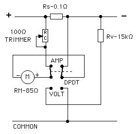 A D.P.D.T. switch and the original voltmeter calibrating resistor (Rv) could be added to the circuit allowing one meter to be used for both amps and volts. See the schematic below.