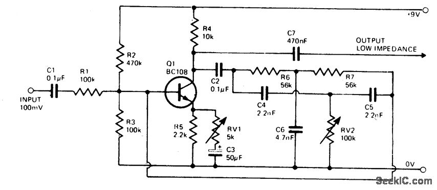 The waa-waa effect is achieved as certain frequencies are amplified more than others.A phase shift RC oscillator makes up the basic circuit. Negative feedback is obtained by feeding part of the signal back to the base. When adjusting initially, RV1 is turned to minimum. RV2 is adjusted to a point at which an audible whistle appears indicating oscillation. RV1 is then adjusted till the oscillation just disappears. It should be possible to set RV2 to any value without any oscillation, this should also be achieved with the minimum possible value of RV1.