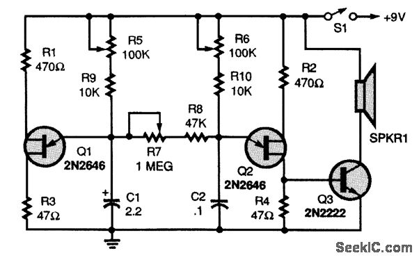 Two unijunction transistors, Q1 and Q2, are connected in a dual-oscillator circuit. Transistor Q1 is connected in a very-low-frequency relaxation oscillator circuit, with C1, R1, R5, and R9 setting the operating frequency. Transistor Q2 is connected in a similar oscillator circuit that operates at a much higher audio frequency. That oscillator's frequency is set by R6, R10, and C2. Resistor R7, a 1-MΩ potentiometer, sets the mixing level of the two oscillators. By adjusting R5, R7, and R6, many strange sounds can be created.